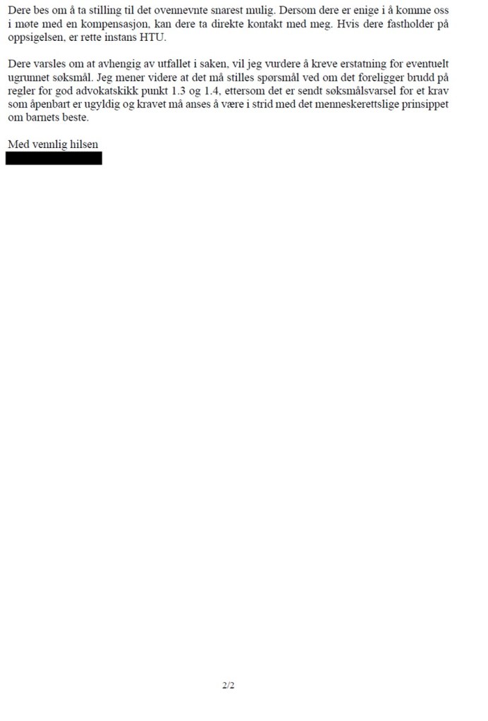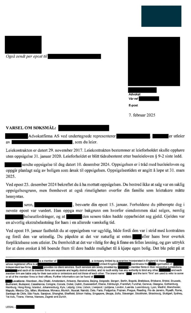 Den 7. februar 2025 sendte X Advokatfirma AS på vegne av utleier følgende søksmålsvarsel: