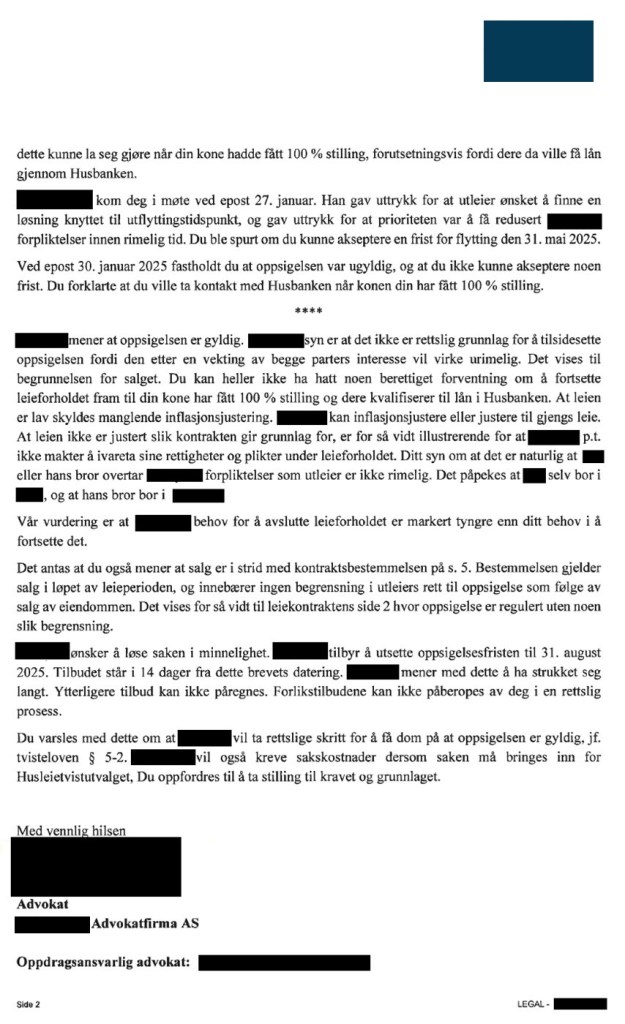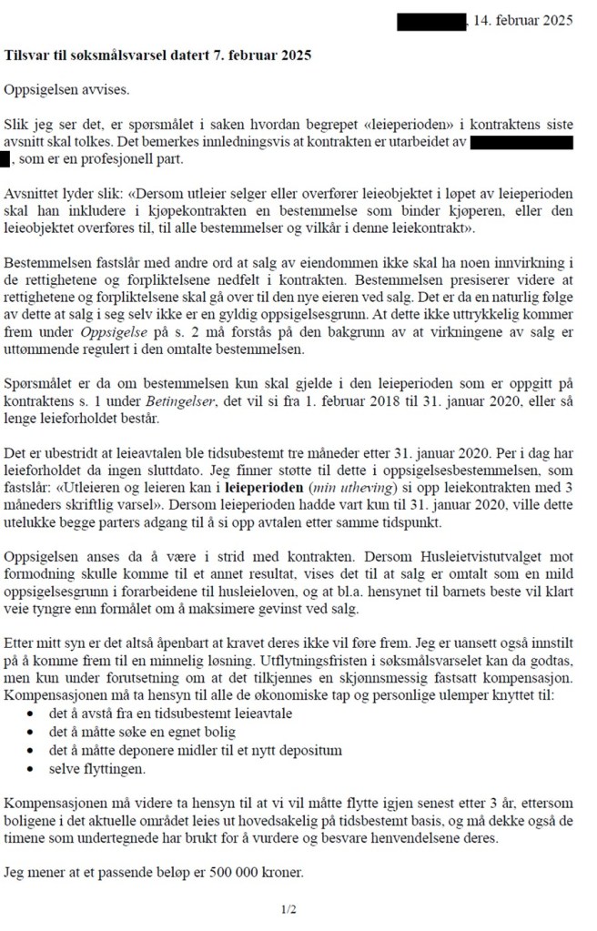 Den 17. februar 2025 sendte leier følgende tilleggsmerknad på e-post til advokaten: «Varsel om oppsigelse har ingen innvirkning i leieforholdet og dermed leieperioden, da oppsigelsen er bestridt, jf. husll. § 9-8 første ledd tredje punktum».